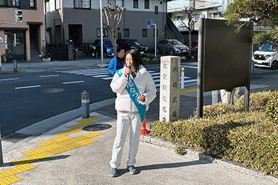 釜利谷の白山道中央T字路で辻立ちを行いました。主に車通行の有権者に向けた活動となりました。(秘書森報告)