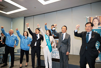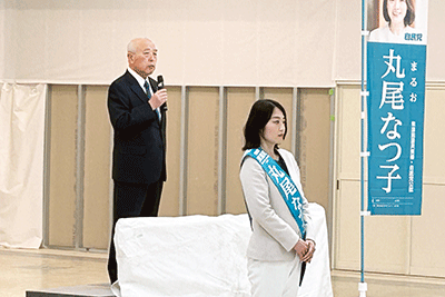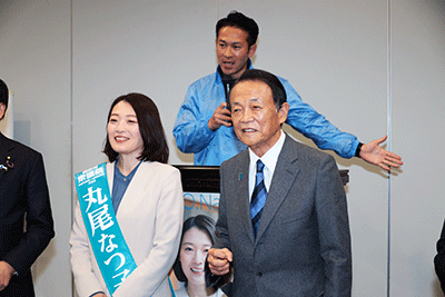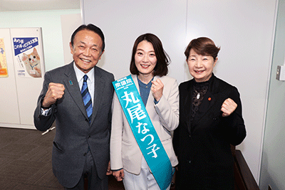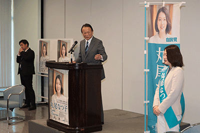 自民党麻生太郎副総裁が丸尾なつ子の個人演説会に応援弁士として参加していただきました。残り2日間の闘い、最後まで頑張れとの激励をいただきました。(秘書森報告)