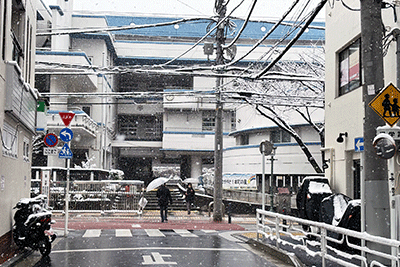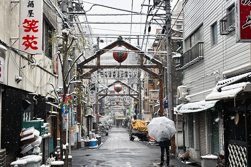 雪です。いつも元気な赤ちょうちんも今日ばかりは寒そう。