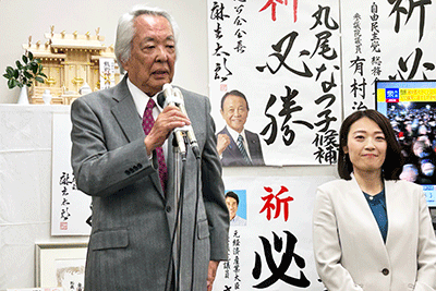 自民党麻生太郎副総裁が丸尾なつ子の個人演説会に応援弁士として参加していただきました。残り2日間の闘い、最後まで頑張れとの激励をいただきました。(秘書森報告)