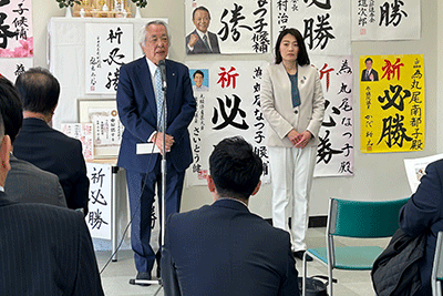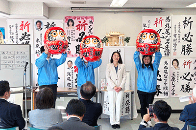 中区での丸尾なつ子候補の出陣式が大洋建設ビルで行われました。選挙区全区の出陣式となり、中区出陣式には三原じゅん子参議が応援演説を行いました。丸尾候補の決意表明の後、候補を囲み「エイ エイ オー」の掛け声で一致結束が図られました。(秘書森報告)