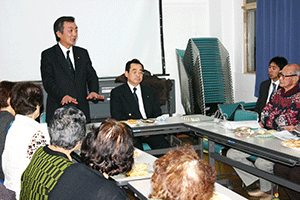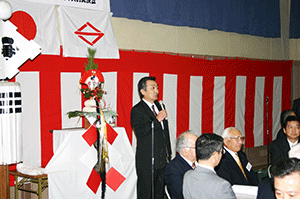 午前11時からは磯子区滝頭地区の新年賀詞交歓会です。堀会長は人に優しい、生きがいのある、安全、安心、福祉の街、滝頭を築くために全力で取り組んでいます。会長のご挨拶の中で、明るく楽しい、日の当たる街を皆さんとつくろうと訴えられました。この地域でも引ったくり、空き巣、車上狙いなど治安対策の必要性を強く感じておられました。