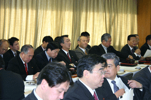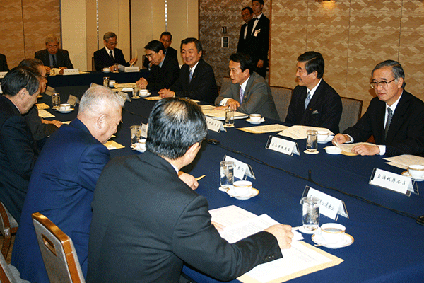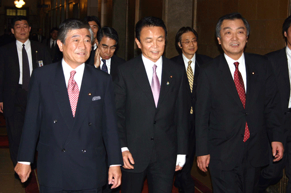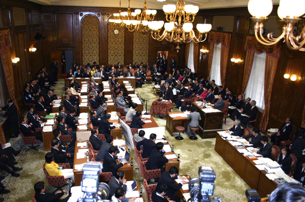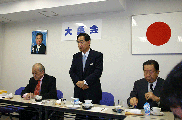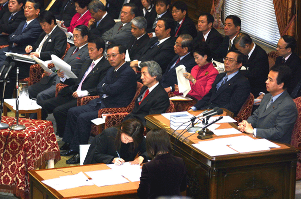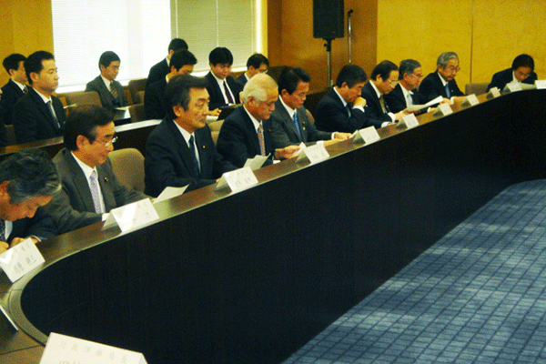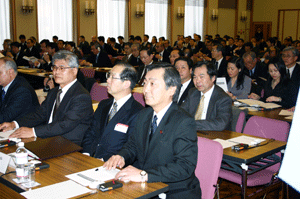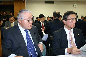 この合同部会の進行係は宮澤洋一事務局長。与謝野馨政調会長のもと、園田博之座長が取りまとめ役です。昨日政府と郵政改革について議論がなされましたので、その様子と、そこに提出された資料が配布され、今後の党としての取り組み姿勢について話し合われました。意見としては、いくら竹中大臣と議論してもすれ違い。「真摯、真摯」と逃げられてしまう、昨年の基本方針そのものが間違っているのだから撤回が必要だ、なぜ公社ではダメなのか説明がない、といった発言が大多数です。一方、少数ではありますが選挙公約の案件であること、また同志閣僚が閣議で了承していることなどを勘案すれば民営化しないことはできない、基本方針の中身について議論すべきだ、などとの意見もあり、まだまだ党内意見はまとまりません。山口俊一前総務副大臣も苦笑い。