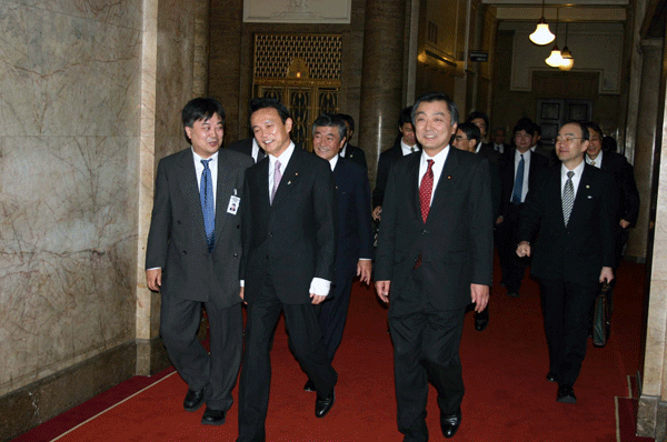 本会議で可決したことを受け、麻生大臣、今井副大臣と共に、議長、副議長、(自)議運委員長、国対委員長、野党の国対委員長に法案成立のお礼回りです。ぐずぐずしていると皆さんいなくなってしまいますから、駆け足の大急ぎで各部屋を訪問しました。