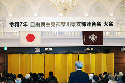 令和7年自由民主党神奈川県支部連合会大会がロイヤルホールヨコハマにて開催されました。県連副幹事長・川崎修平県議、新井絹世県議の司会進行で開会になり、冒頭、県連副会長・牧島功元神奈川県議会議長のご逝去、また県連国会秘書会会長であり県連会長・小泉進次郎衆議の鍋倉正樹秘書がご逝去されたことに対し、参加者皆さんにより黙禱が捧げられました。そして続いて国歌、党歌斉唱がありました。