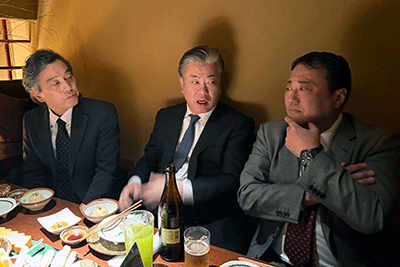 自民党若手国会議員との勉強会があり、終了後に居酒屋さんにチョイ寄りしたら、何と維新の遠藤敬(たかし)衆議院議員とばったり出会いました。私が国対委員長代理だったころ毎日のように顔を会わせていた大先生です。混沌とした日本の政治状況ですが、今後の課題などについて意見しました。お元気そうで何よりでした。(純)