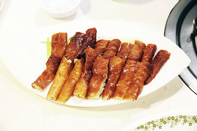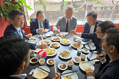 昼食は北方料理、瀋陽地方の家庭の味が堪能できるレストラン種福園本店にお邪魔しました。日台関係についてお話をいただいたのは陳宗彦元政府報道官です。中華風のもちもちとしたクレープに牛肉と豆干の炒め物などを乗せて巻いて食べる料理を堪能しました。店内もカジュアルな雰囲気で入りやすいお店でした。(秘書白石報告)