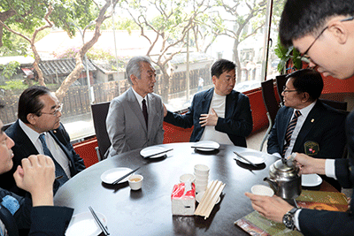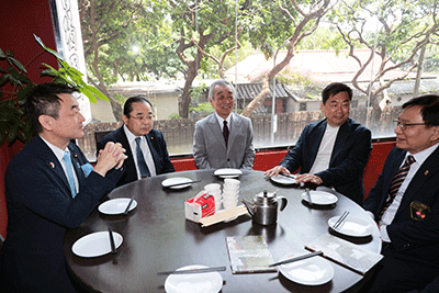 台北松山空港に到着後、台湾日本関係協会・蘇嘉全会長とROUbyT-HAMにて昼食懇談会を行いました。その他、台湾日本関係協会・范振国(はんしんこく)秘書長(次期横浜弁事処処長予定者)、外交部・蘇定東氏、李杰宏氏、台湾日本語国際化協会・呉其哲理事長、台湾日本人会・徳光重人氏が参加され台湾、日本両国の外交、経済、農水関係の課題等に関し意見交換がなされました。(秘書白石報告)