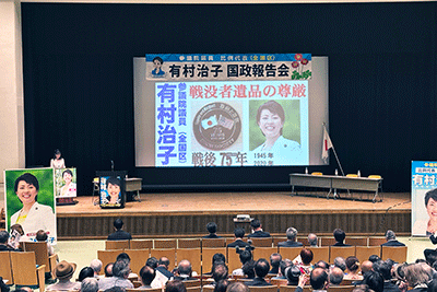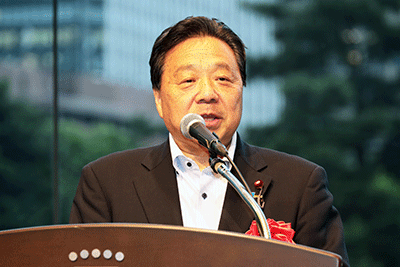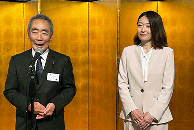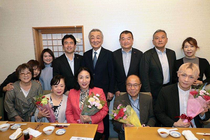 続いて山中竹春市長、渋谷たけし市会議長、自由民主党横浜支部連合会・佐藤茂会長、(公社)2027年国際園芸博覧会協会・河村正人事務総長から祝辞が述べられ、自民党横浜市連の各議員が山下正人幹事長らから順次一言挨拶が行われました。続いて国会議員挨拶となり、前神奈川1区支部長・松本純より、「日本の美しさ、日本人の心を大きく世界にも訴えていただくのがグリーンエキスポ2027です。皆さんそれに向けて一致結束して大いに頑張っていただきたいと心よりご活躍をお祈り申し上げます」と挨拶し、後継者となった丸尾なつ子さんの紹介が行われました。神奈川1区・丸尾なつ子支部長からは、松本の後継者としての重責を担い国政に臨む思いを述べられました。国会議員代理秘書挨拶に続き来賓者紹介と祝電披露、少し遅れて出席された自民党参議院選挙・わき雅昭公認候補予定者の挨拶がなされました。この後、乾杯の発声で祝宴となりました。(秘書森報告)