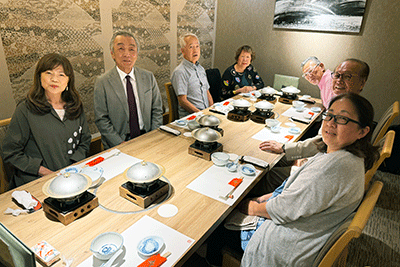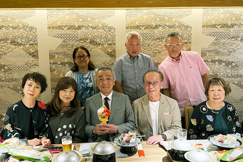 聖光学院6期生の大村剛一氏(63年間の付き合い)をリーダーとしたブルーミング中西元専務・中西國容氏(故人)を囲む「國容会」のメンバーに私の受章を祝い夕食懇談会を開いていただきました。懐かしい顔が揃いました。料理店からもお祝いの花束をいただくなど楽しい会話の時間でした。これからも友情を大切にしようと、「老骨に鞭打つゴルフコンペ」の計画が持ち上がりました。(純)