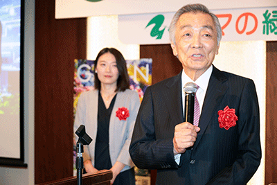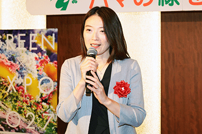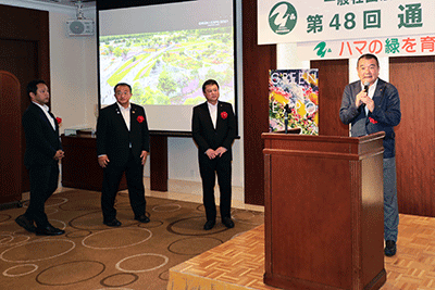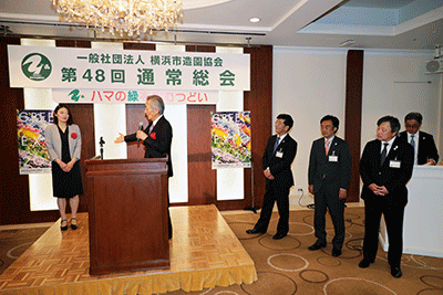 横浜市造園協会第48回通常総会第2部「ハマの緑を育むつどい」が県民共済プラザビルで開催されました。同協会・田澤重幸会長より、「先程、第48回通常総会が終了し引き続き会長を仰せつかりました田澤です。ここに並んだ新役員と共に事業を進めて参ります。2027国際園芸博覧会の開催まで2年を切り、会場となる公園整備も進み会場らしくなって来ました。私ども造園協会は園芸博のテーマである『幸せをつくる明日の風景』の正にその風景を創造していく団体だと思っています。園芸博は6ヶ月ほどで終了しますが、花や緑のオープンスペースを創造する業種の特性を生かし、この横浜の街づくりのために誠心誠意協力させていただきたいと思っています」とご挨拶されました。