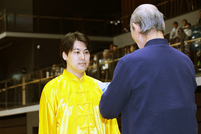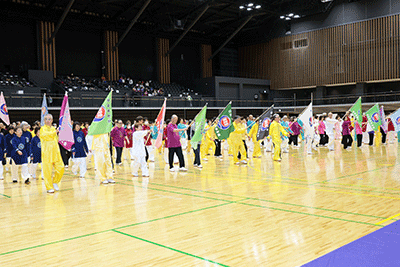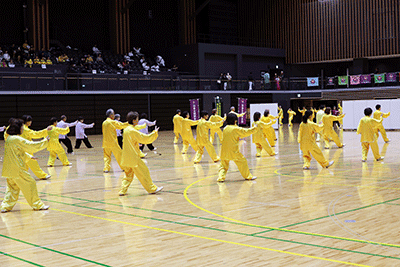 日本太極拳友会交流演舞大会が横浜武道館「メインアリーナ」にて開催されました。開会宣言に続き三代正廣会長が開会挨拶をされ、その後、各種表彰が行われました。次に来賓挨拶となり世界永年太極拳連盟・傳清泉主席より祝辞が述べられ、引き続き、松本純名誉会長が挨拶し、「本日は交流大会のご開催おめでとうございます。また大会関係者の皆様のご尽力に敬意と感謝を申し上げます。三代会長とは34年のお付き合いをさせていただいております。その間、ずっと一貫して仰っている言葉がありまして忘れる事が出来ません。その言葉は『自分と向き合い、自然をみつめ敬意を払いながら、命のエネルギーを生み出していく、人知れぬ努力はおのずとその人の風格や自信となって現れる』これは太極拳だけにとどまらず人の生き方そのものにも通じるものだと思っております。そして太極拳そのものが世界の平和に貢献するものと確信しておりますし皆様が更に精進をされ、それぞれの技術の向上がなされる事をご祈念申し上げます」と述べました。続いて松本研顧問からも祝辞が述べられ、矢島孝一郎大会実行委員長から各団体の来賓紹介がなされました。オープニング演舞はジュニア長拳、24式太極拳集団などの演舞が行われました。(秘書白石報告)